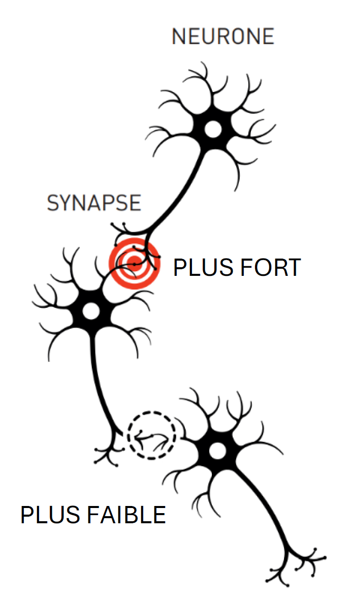 Le réseau neuronal du cerveau est constitué de cellules vivantes, les neurones, dotées d’une machinerie interne avancée. Ces neurones peuvent s’envoyer des signaux via les synapses. Lorsque nous apprenons des choses, les connexions entre certains neurones se renforcent, tandis que d’autres s’affaiblissent.