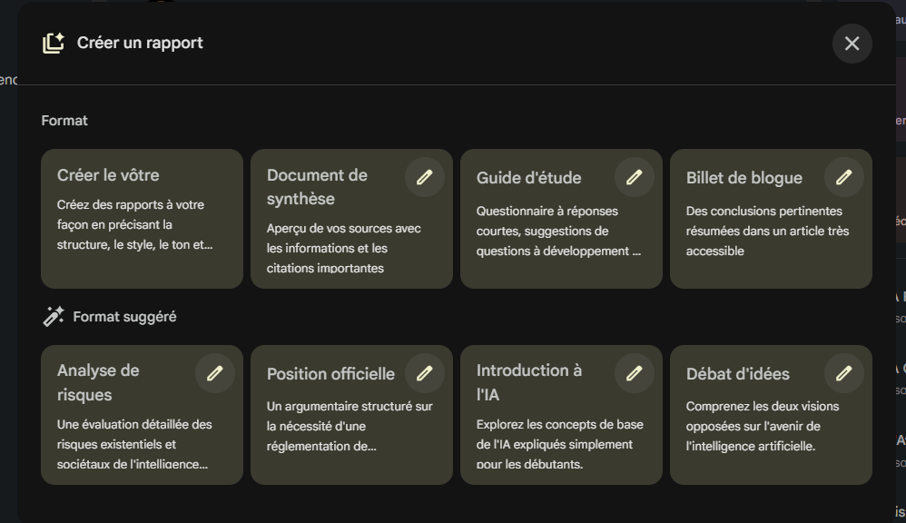 Avec l’option Rapports, NotebookLM permet de transformer un corpus de documents ou de données en textes organisés selon différents formats : documents de synthèse, guides d’étude, billets de blogue, voire analyses de risques ou positions officielles. L’étudiant peut aussi créer son propre rapport en choisant le style, le ton et la structure. Cette flexibilité en fait un outil idéal pour rédiger des travaux scolaires, préparer une présentation ou encore simuler un débat d’idées sur des enjeux scientifiques et éthiques. Les rapports générés aident non seulement à mieux comprendre l’information, mais aussi à développer des compétences en communication scientifique et en esprit critique.