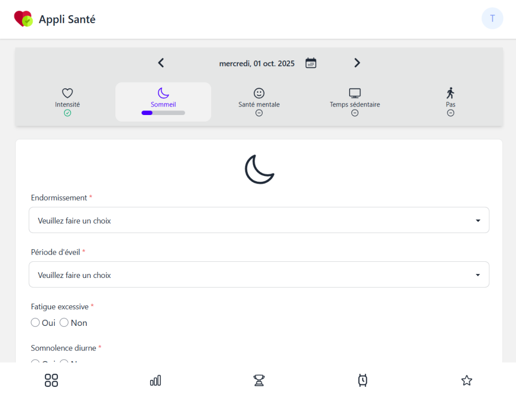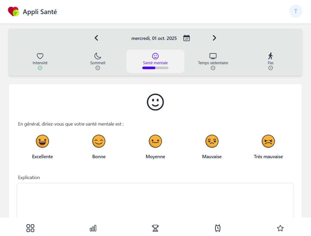 Cette application web est conçue pour encourager les étudiants à prendre en charge leurs habitudes de vie. Elle leur permet de recueillir des données sur trois comportements clés :