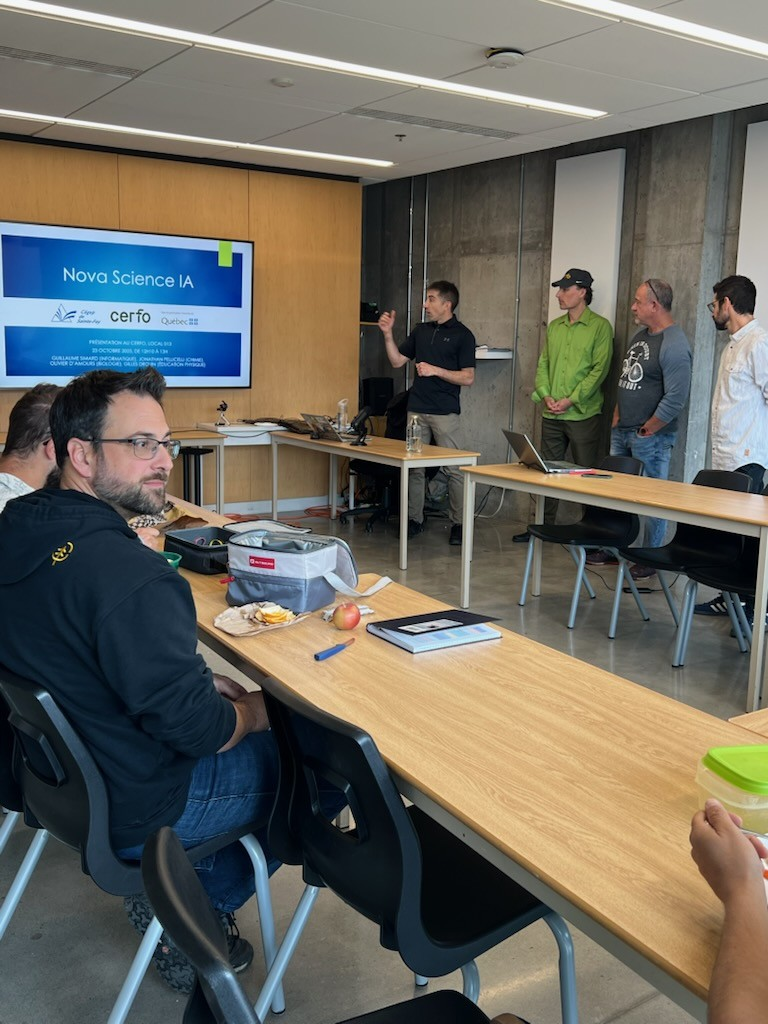 Le 23 octobre 2025, une présentation au CERFO a permis de partager les réalisations et les apprentissages issus de cette collaboration. L’événement a réuni quatre enseignants du cégep : Guillaume Simard (informatique), Jonathan Pellicelli (chimie), Olivier D’Amours (biologie) et Gilles Drouin (éducation physique). Leur présentation a mis en lumière des exemples concrets d’intégration de l’IA dans leurs disciplines respectives et les retombées pédagogiques observées auprès des étudiants.