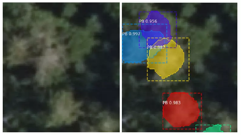 De façon plus spécifique, la figure 6 est un exemple de détection à l’arbre près et dénombrement de pins blancs (PB) avec leur diamètre de cime dans la région de l’Outaouais à partir d’orthophotos (méthode 1). Les chiffres indiquent la probabilité de présence du pin blanc dans chaque emprise géométrique. Une valeur proche de 0 indique une incertitude totale alors qu’une valeur proche de 1 indique une confiance très élevée. Pour arriver au même résultat, les méthodes traditionnelles auraient nécessité l’utilisation de l’imagerie multispectrale coûteuse.